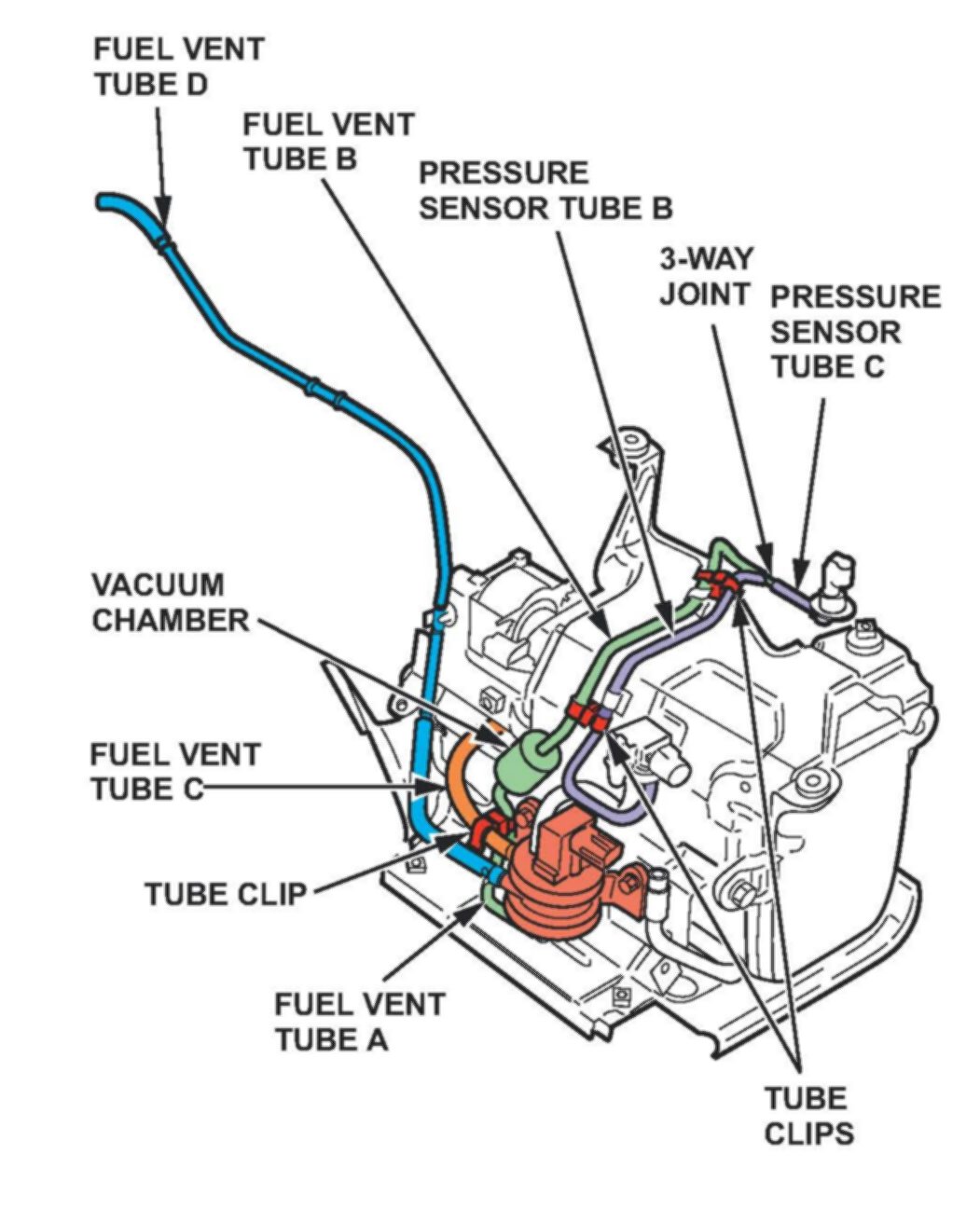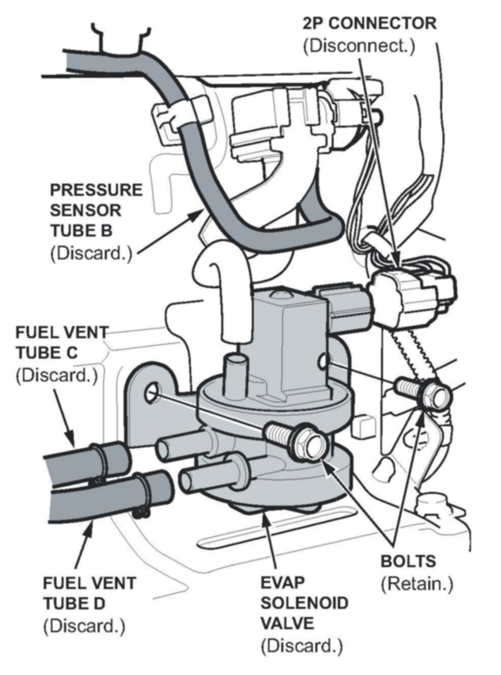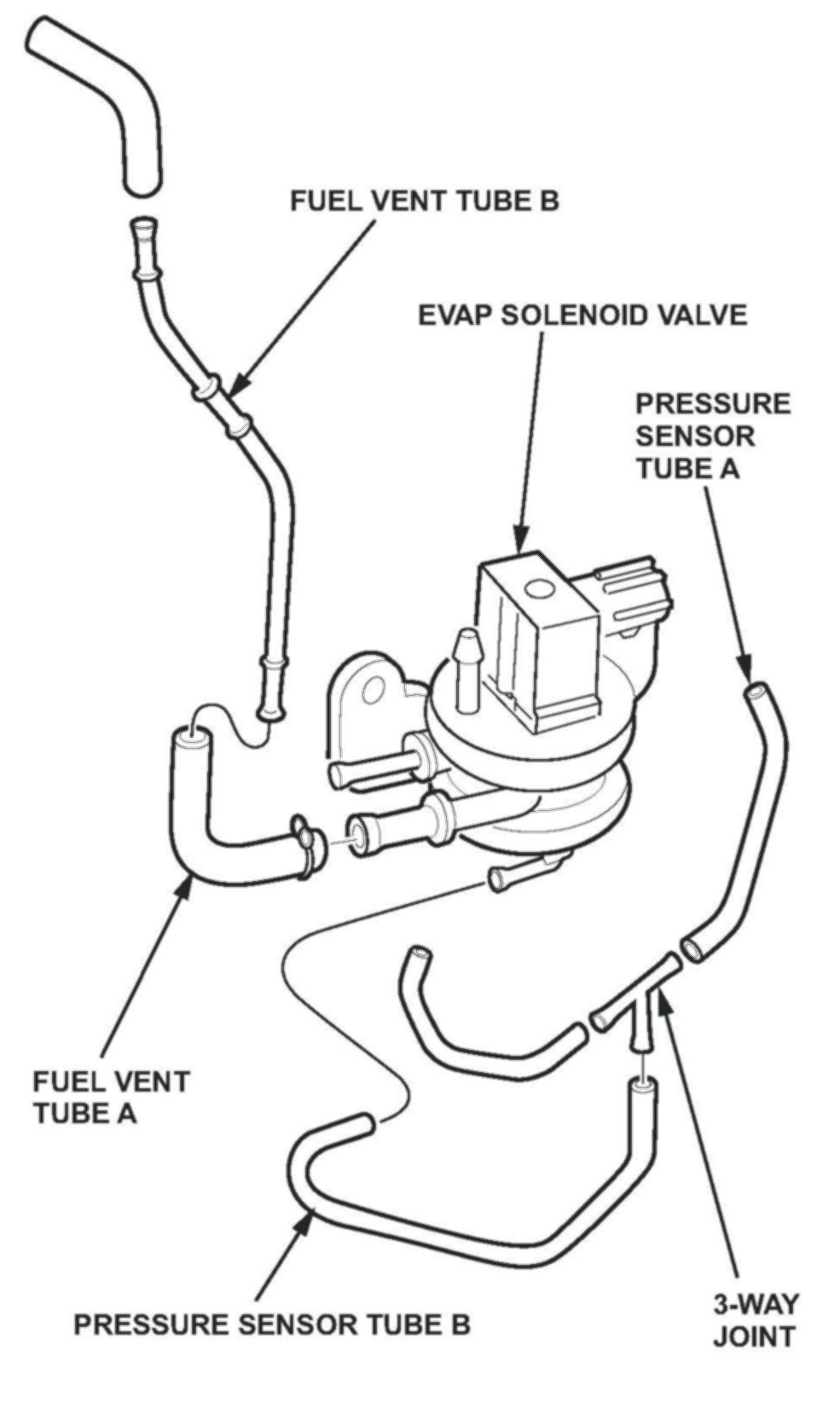 ^ Disconnect fuel vent tube C from the EVAP solenoid valve. The tube will be reused.