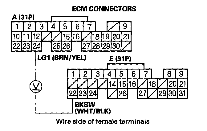 3. Measure voltage between ECM connector terminals A24 and E22 with the brake pedal pressed.