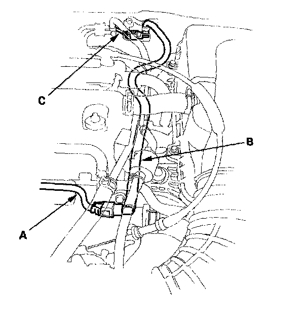 4. Align the quick-connect fittings with the line (A), and align the retainer locking tabs (B) with the connector tabs (C). Then press the quick-connect fittings onto the line until both retainer pawls lock with a clicking sound.