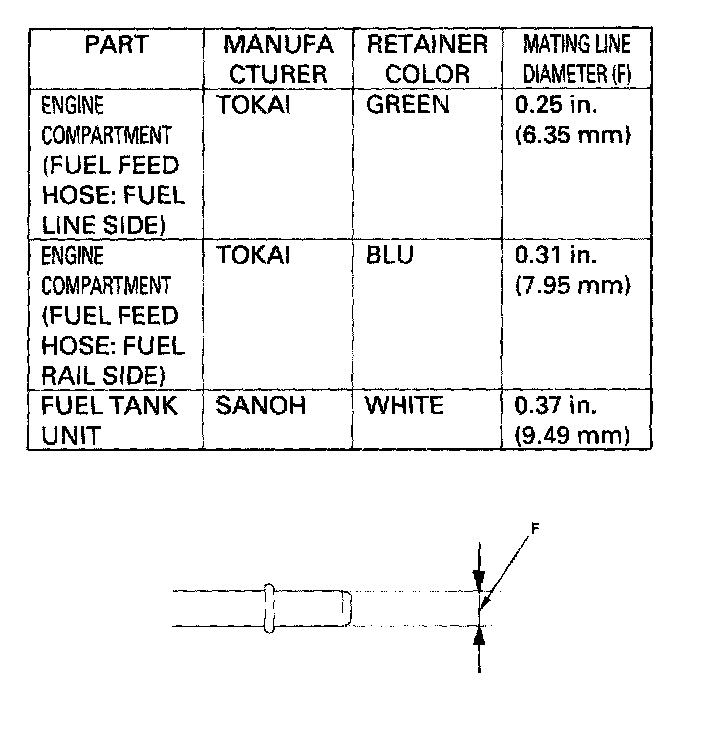 Fuel Line/Quick-Connect Fitting PrecautionThe fuel tube/quick-connect fittings connect the fuel rail (A) to fuel feed hose (B), the fuel feed hose (B) to the fuel line (C), and the fuel tube (D) to the fuel pump assembly (E). When removing or installing the fuel feed hose, fuel pump assembly, or fuel tank, it is necessary to disconnect or connect the quick-connect fittings.