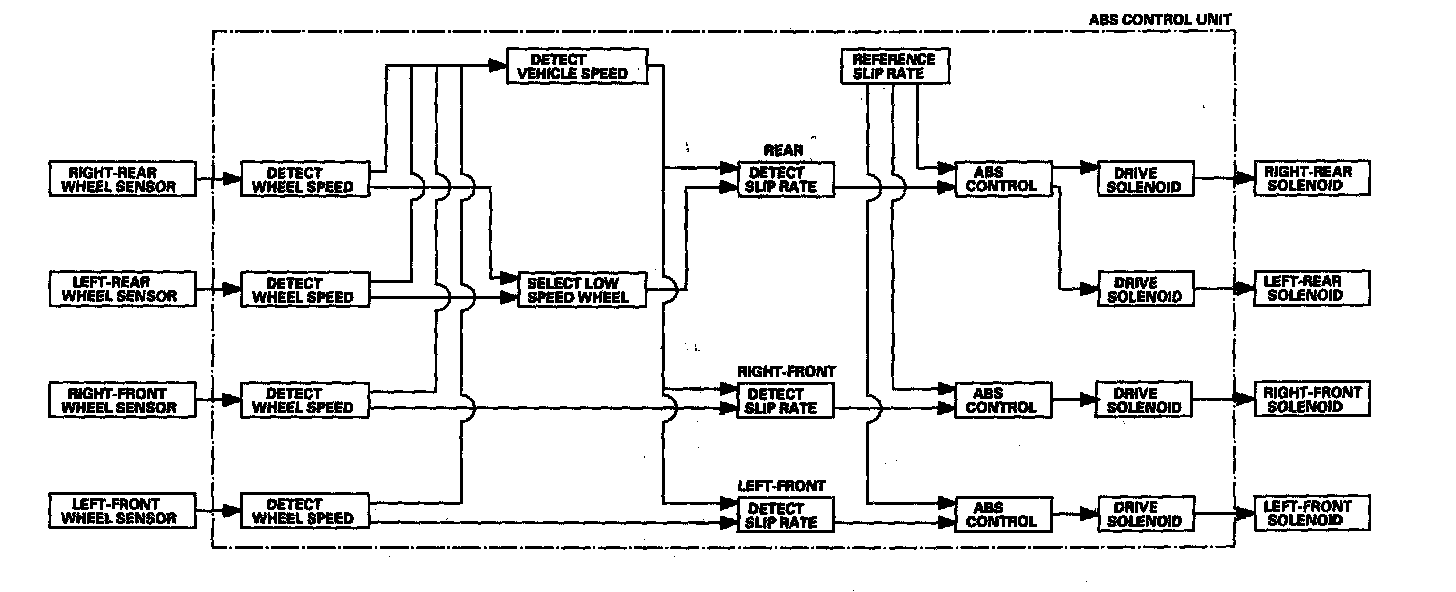 The ABS control unit calculates the slip rate of each wheel, and transmits the control signal to the modulator unit solenoid valve when the slip rate is high.