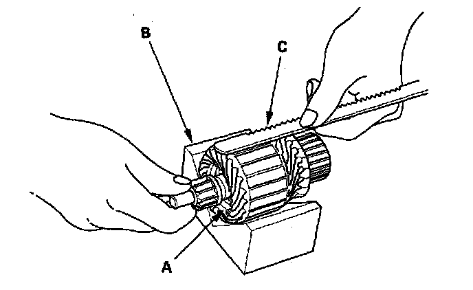 9. Place the armature (A) on an armature tester (B). Hold a hacksaw blade (C) on the armature core. If the blade is attracted to the core or vibrates while the core is turned, the armature is shorted. Replace the armature.