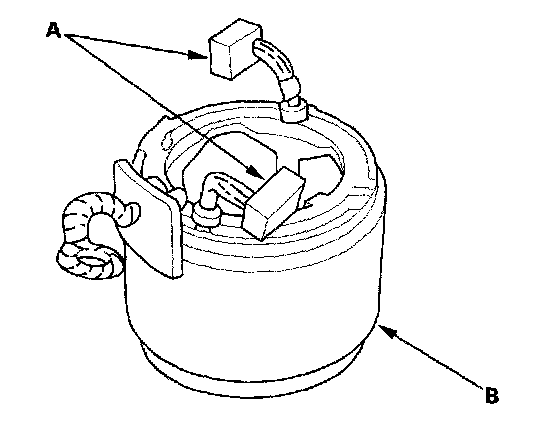 13. Check for continuity between each brush (A) and the armature housing (B). If there is continuity, replace the armature housing.