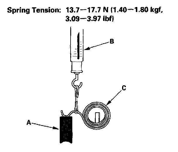 15. Insert the brush (A) into the brush holder, and bring the brush into contact with the commutator, then attach a spring scale (B) to the spring (C). Measure the spring tension at the moment the spring lifts off the brush. If the spring tension is not to specification, replace the spring.