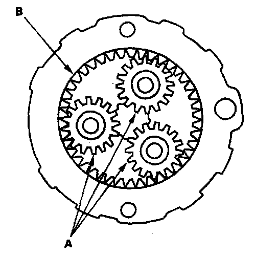 16. Check the planetary gears (A) and ring gear (B). Replace them if they are worn or damaged.
