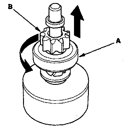 19. If the starter drive gear (B) is worn or damaged, replace the overrunning clutch assembly; the gear is not available separately. Check the condition of the flywheel ring gear. Replace the flywheel if the ring gear teeth are damaged.