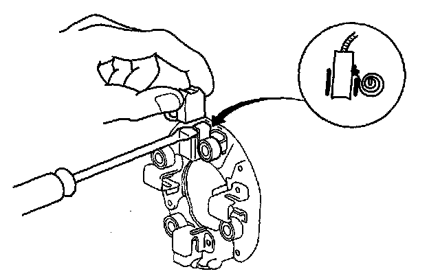 21. Install the armature in the housing, and install the brush holder. Next, pry back each brush spring again, and push the brush down until it seats against the commutator, then release the spring against the end of the brush.