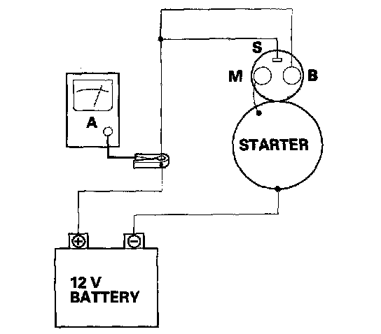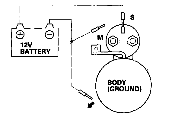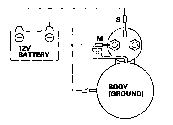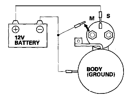 2. Make a connection as shown using as heavy a wire as possible (preferably equivalent to the wire used for the vehicle). To avoid damaging the starter, never leave the battery connected for more than 10 seconds.