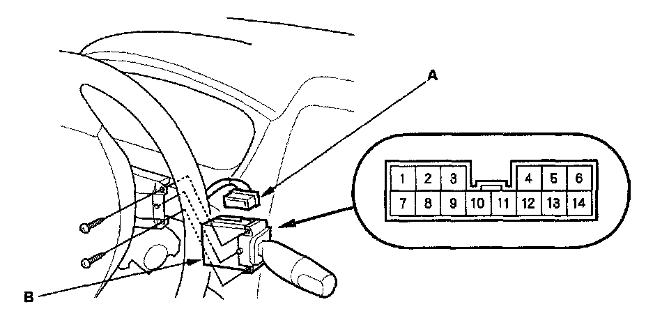 3. Disconnect the 14P connector (A) from the wiper/washer switch (B)