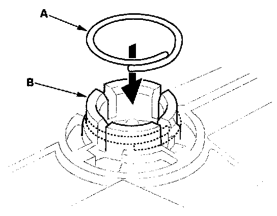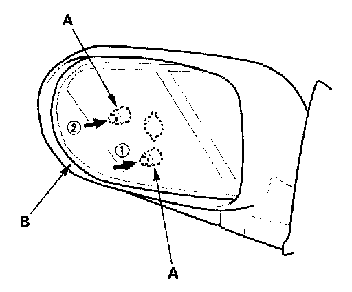 1. Install the snap rings (A) into the joint pin receptacles (B) on the mirror holder. In case of the new mirror holder, make sure the snap rings are installed properly.