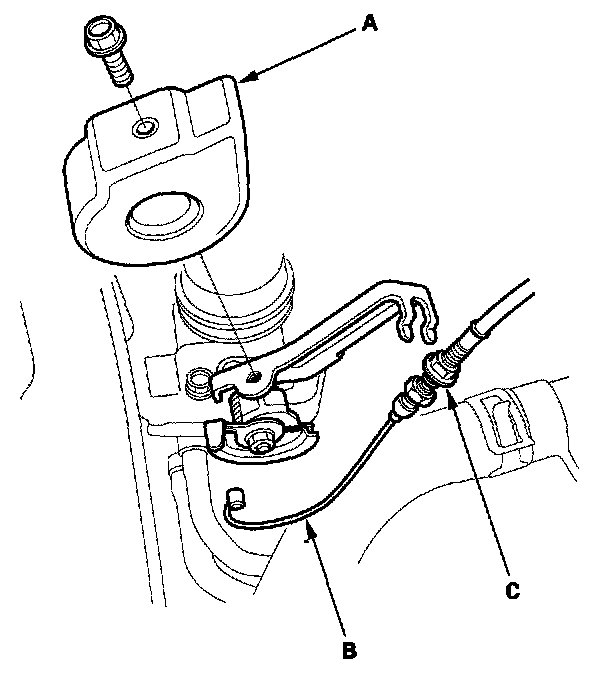 9. Remove the throttle cover (A), then remove the throttle cable (B) by loosening the locknut (C), then slipping the cable end out of the accelerator linkage. Take care not to bend the cable when removing it. Always replace any kinked cable with a new one.
