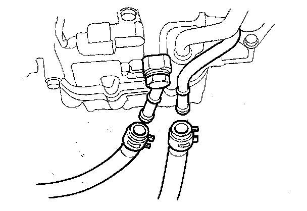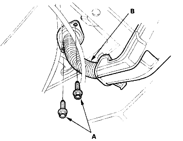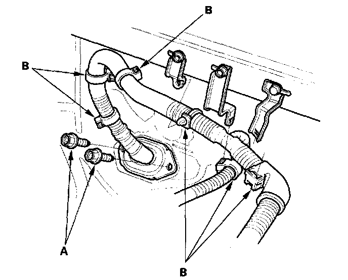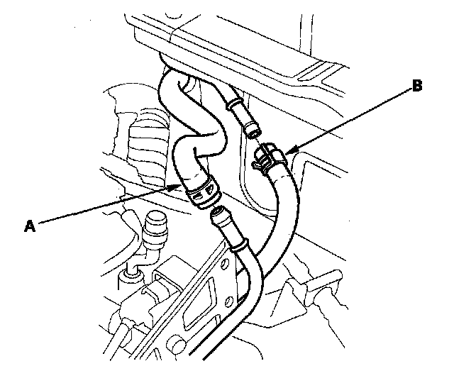10. Remove the brake booster vacuum hose (A) and the evaporative emission (EVAP) canister hose (B).