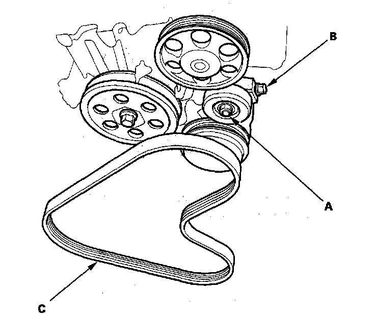 17. With A/C model: Loosen the idler pulley center nut (A), then turn the adjusting bolt clockwise (B). Remove the water pump-A/C compressor belt (C).