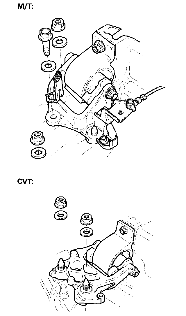 24. Install the shift cables, manual transmission (M/T), continuously variable transmission (CVT).
