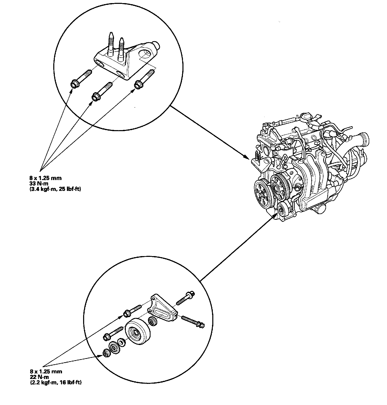 1. Install the engine mount and the idler pulley, and tighten their bolts to the specified torques.