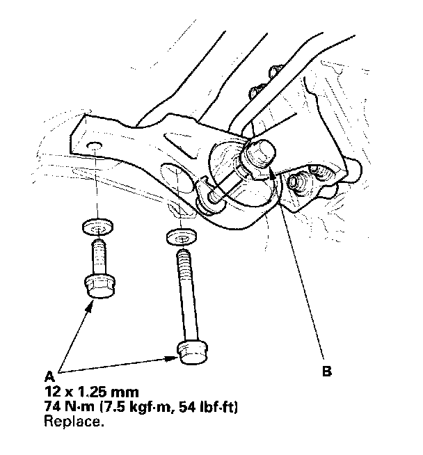 3. Tighten the transmission mount bracket mounting bolt/nuts (A), then loosen the transmission mount bolt (B).