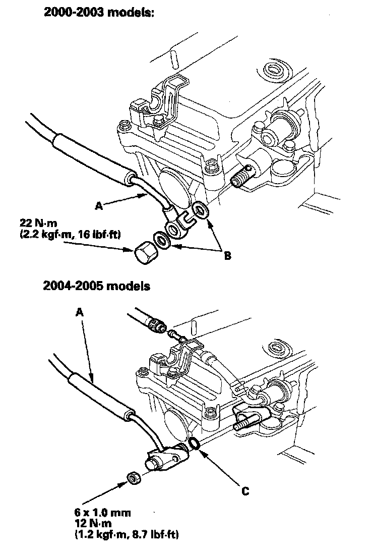 30. Install the fuel feed hose (A) with new washers (B) (2000-2003 models) or with a new O-ring (C) (2004-2005 models).