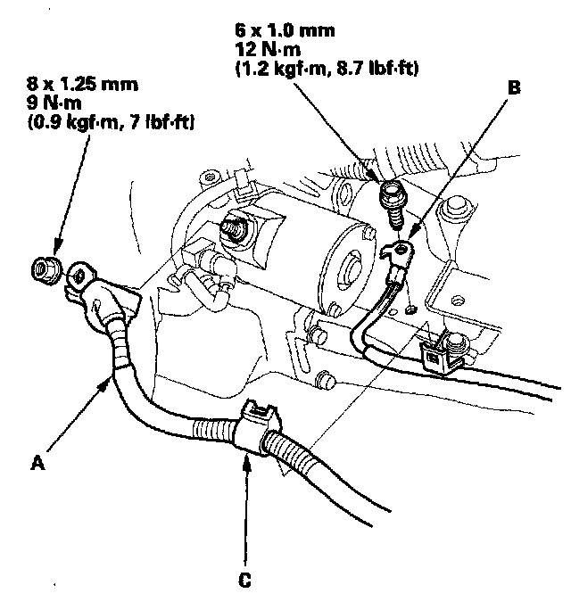 11. Remove the ground cable (A), starter cable (B), and harness clamp (C).