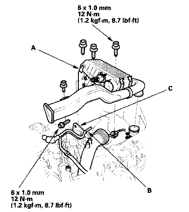 8. Remove the breather pipe (A) and brake booster vacuum hose bracket (B) from the air cleaner housing, then remove the air cleaner housing/ intake air duct assembly (C).