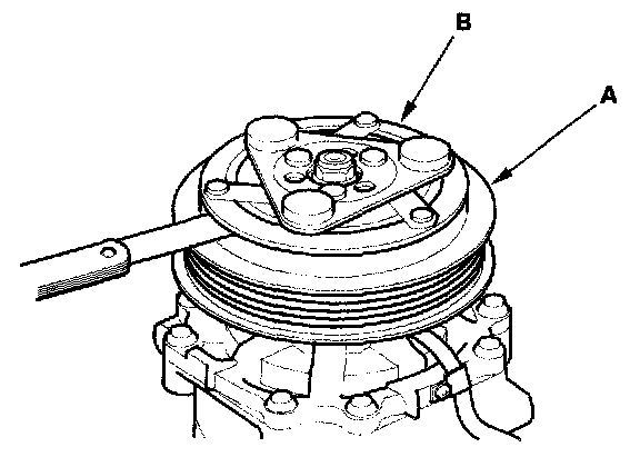 3. Measure the clearance between the rotor pulley (A) and the armature plate (B) all the way around. If the clearance is not within specified limits, remove the armature plate and add or remove shims as needed to increase or decrease clearance.