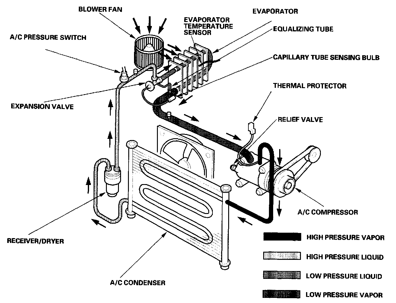 If the refrigerant pressure becomes too high (due to blockage or lack of airflow at the A/C condenser), or too low (due to leakage), the A/C pressure switch stops the A/C request and the signal to the ECM and the A/C compressor stops operating.