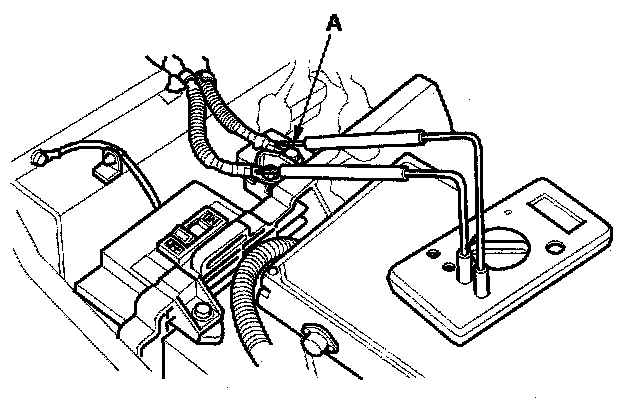 8. Measure voltage at the junction board terminals (A). There should be 30 V or less. If more than 30 V is present, there is a problem in the circuit; do the DTC troubleshooting before continuing.