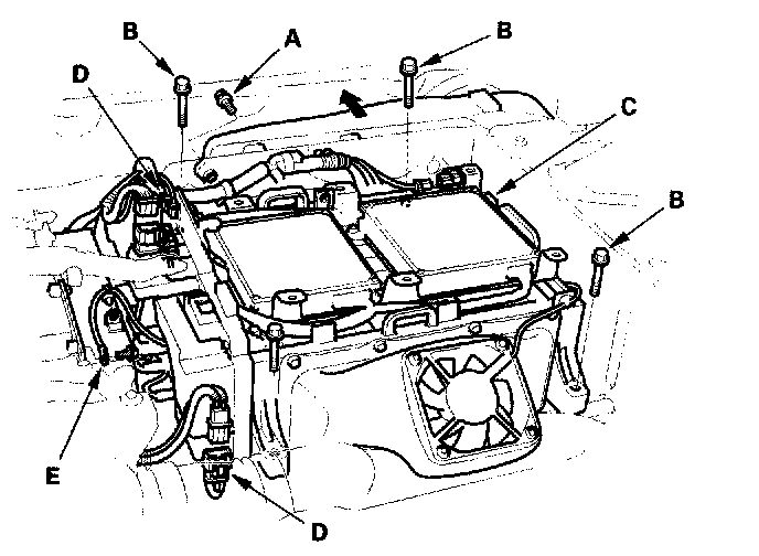 13. Remove the mounting bolts (B) from the battery module (C). Disconnect the connectors (D) and Y condenser terminal (E).