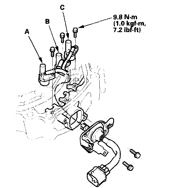 4. Install the guide pins (A), then remove the remaining three bolts (B).