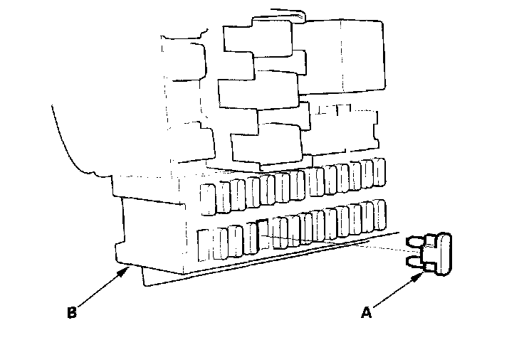^ Turn the ignition switch OFF, and remove the No. 18 BACK UP (7.5 A) fuse (A) from the under-dash fuse/ relay box (B) for 10 seconds.