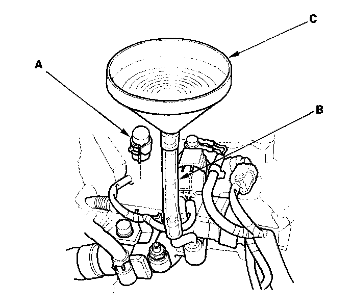12. Remove the cap (A) from the water outlet, then install an 8 mm hose (B) and a funnel (C).