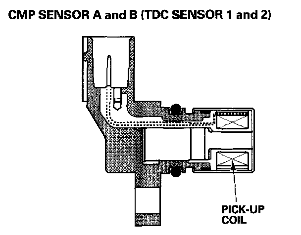 Camshaft Position (CMP) A and B (Top Dead Center (TDC) 1 and 2), and Crankshaft Position (CKP) SensorsThe CMP A (TDC 1) and CMP B (TDC 2) sensors detect the position of the No.1 cylinder as a reference for sequential fuel injection to each cylinder. The CKP sensor detects engine speed and is used as one input to determine ignition timing and timing for fuel injection of each cylinder.