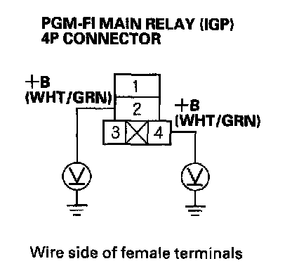 4. Measure voltage between body ground and PGM-FI main relay (IGP) 4P connector terminals No.2 and No.4 individually.