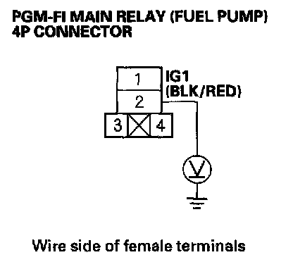 7. Measure voltage between PGM-FI main relay (FUEL PUMP) 4P connector terminal No.2 and body ground.