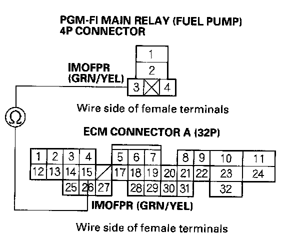 11. Check for continuity between PGM-FI main relay (FUEL PUMP) 4P connector terminal No.3 and ECM connector terminal A15.