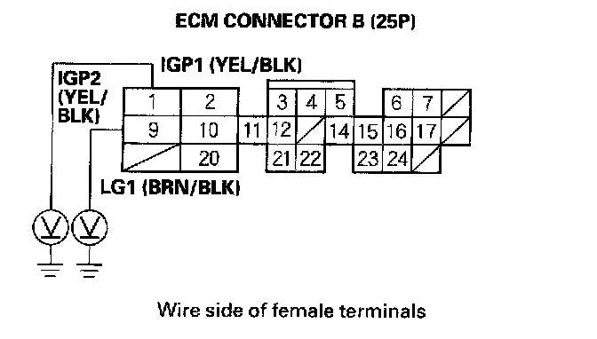 14. Measure voltage between body ground and ECM connector terminals B1 and B9 individually.