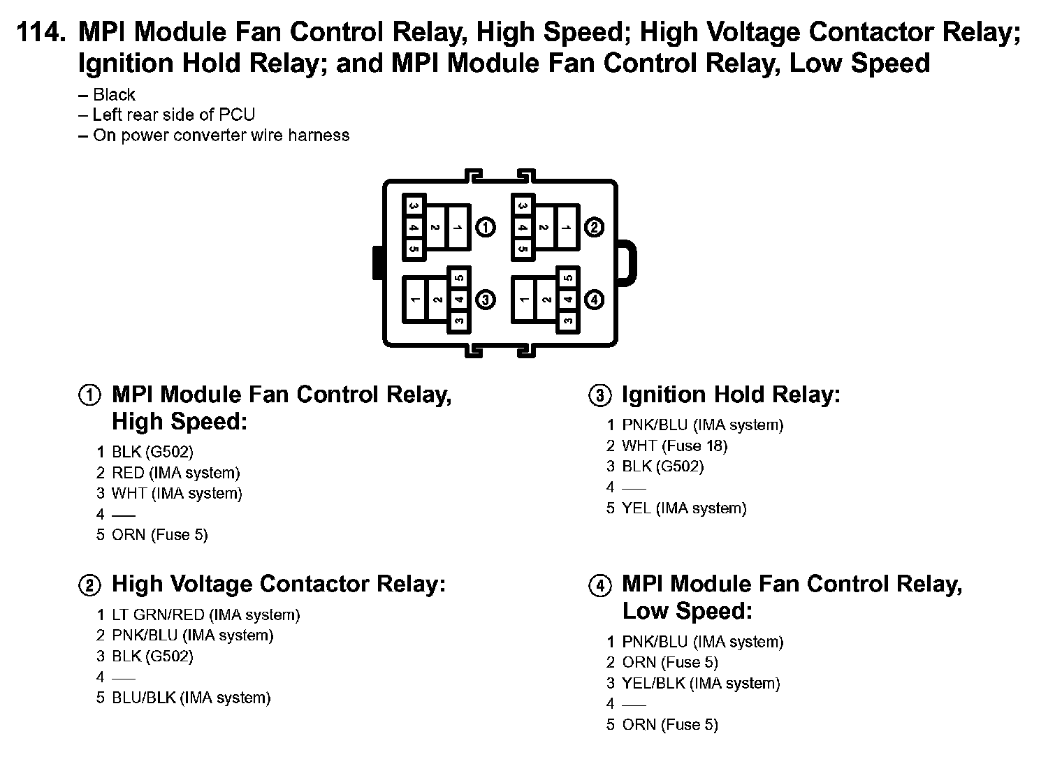 114. MPI Module Fan Control Relay, High Speed; High Voltage Contactor Relay; Ignition Hold Relay; And MPI Module Fan Control Relay, Low Speed: