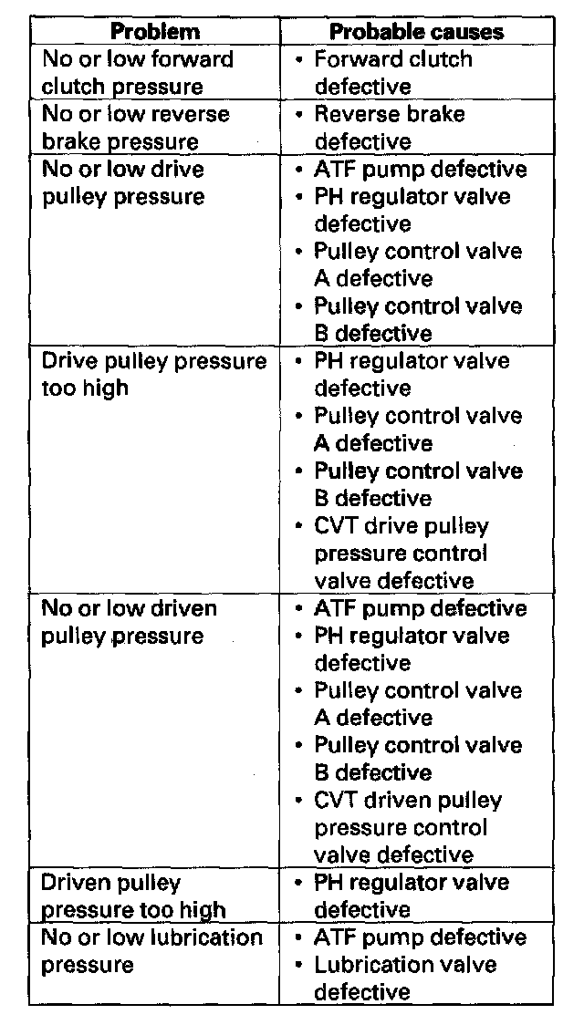 ^ Drive pulley pressure and driven pulley pressure may be above 3,430 kPa (35.0 kgf/cm2, 498 psi) when there is a transmission problem that causes the TCM to go into fail-safe mode.
