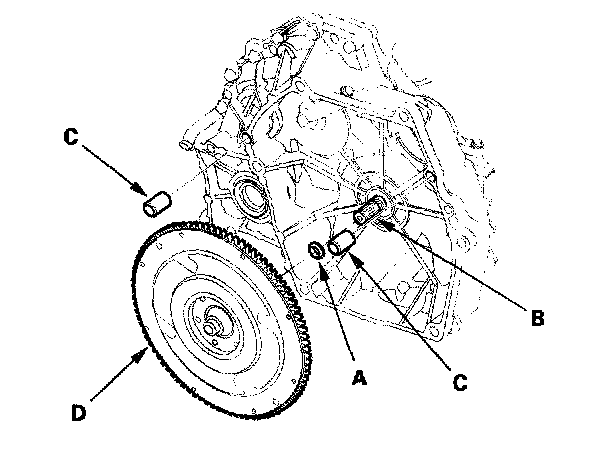 5. Install a new rubber sealing ring (A) on the input shaft (B), and install the 14 mm dowel pins (C) in the flywheel housing.