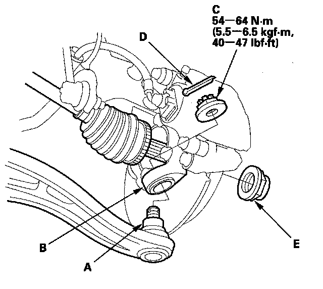 19. Connect the ball joints (A) to the knuckles (B), and install the castle nuts (C) and new cotter pins (D).