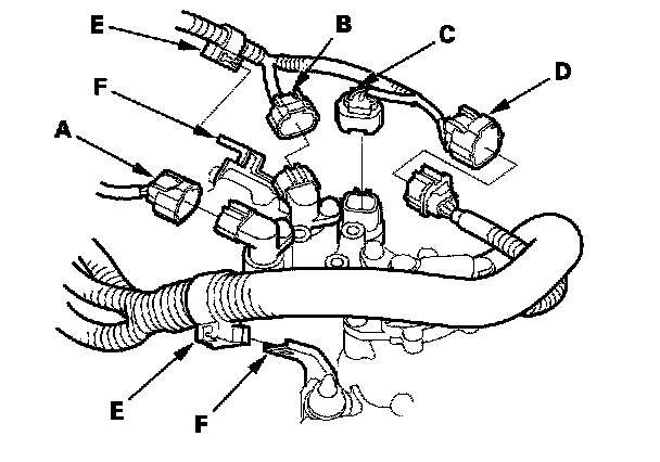 23. Connect the transmission range switch connector (D), and install it on the connector bracket, then install the harness clamps (E) on the brackets fully.