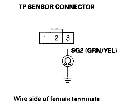 YES- Check for a short to ground in the wire between TP sensor connector terminal No. 3 and ground. If the wire is OK, replace the TP sensor.