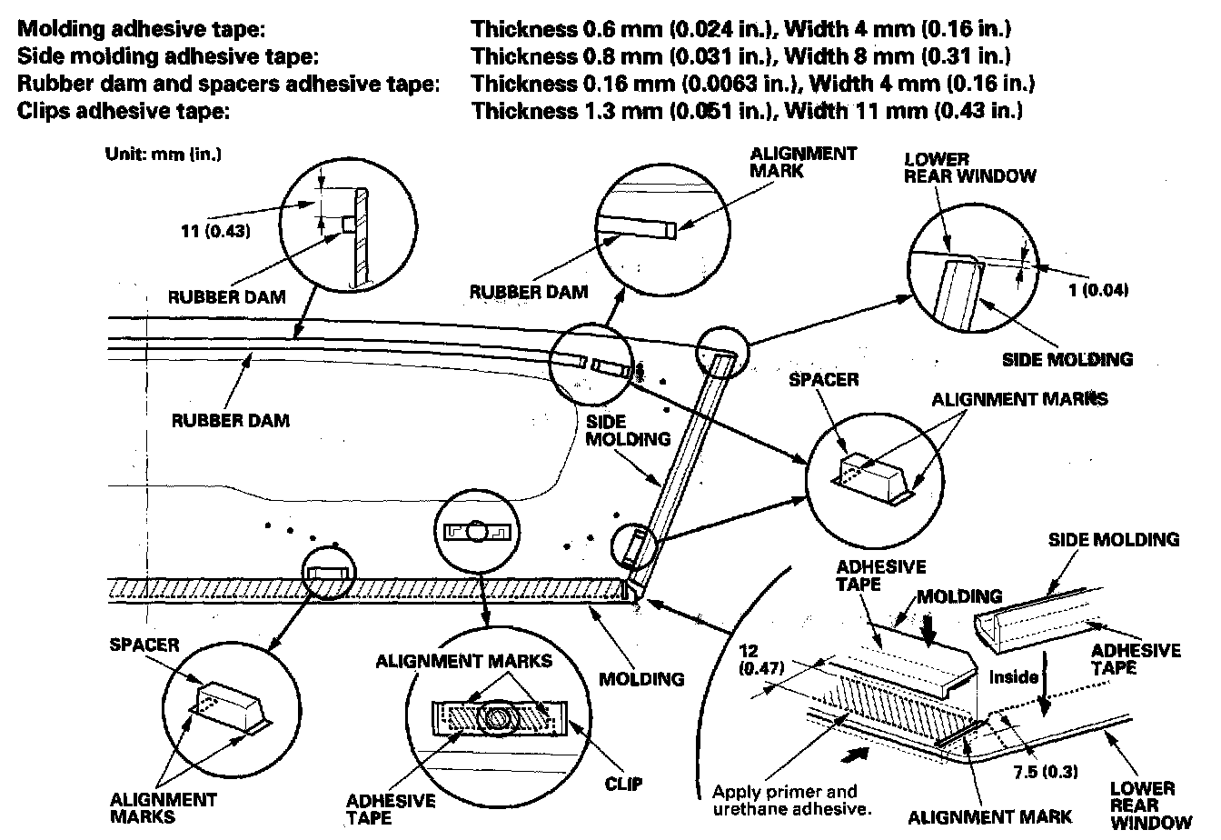 - To attach the molding, apply a light coat of primer to the areas between the alignment marks on the tower rear window, and attach the molding with urethane adhesive and adhesive tape and the side molding with adhesive tape.