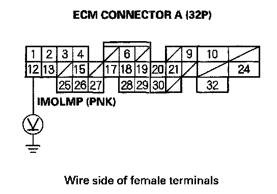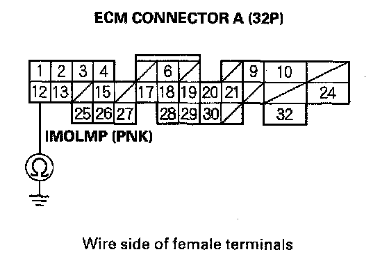 11. Check for continuity between the ECM connector A (32P) No. 12 (IMOLMP) terminal and body ground.