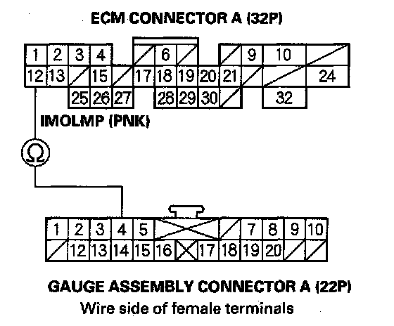 17. Check for continuity between the ECM connector A (32P) No. 12 (IMOLMP) terminal and gauge assembly connector No. 4 terminal.