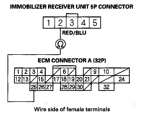 35. Check for continuity between the immobilizer receiver unit 5P connector No. 2 (IMOCD) terminal and ECM connector A (32P) No. 25 terminal.