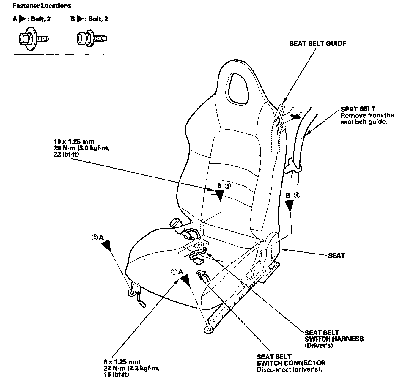 - Tighten the seat mounting bolts to the specified torque in the sequence shown. Slide the seat all the way back and tighten (1) and (2), then slide it forward and tighten (3) and (4).