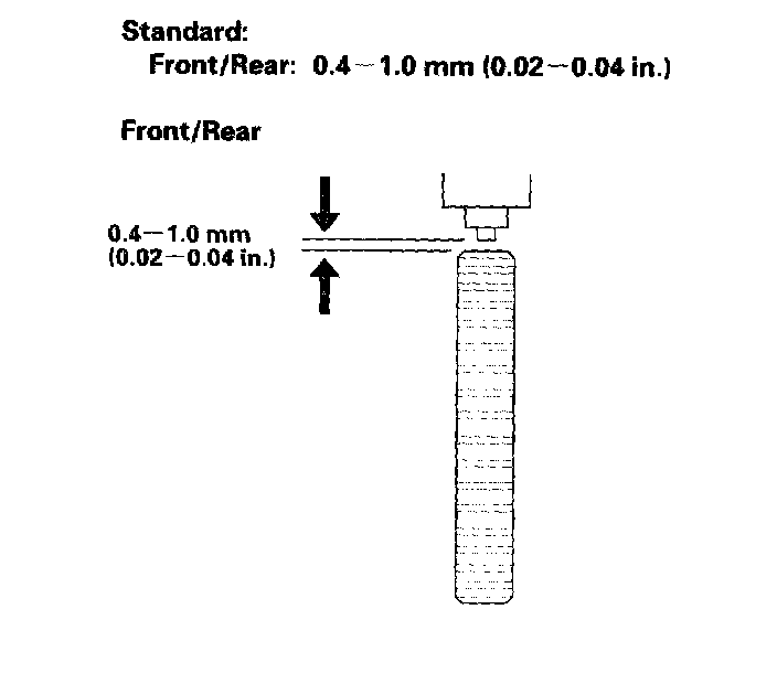 2. Measure the air gap between the wheel sensor and purser all the way around while rotating the purser. Remove the rear brake disc to measure the gap on the rear wheel sensor. If the gap exceeds 1.0 mm (0.04 inch), check for a bent suspension arm.