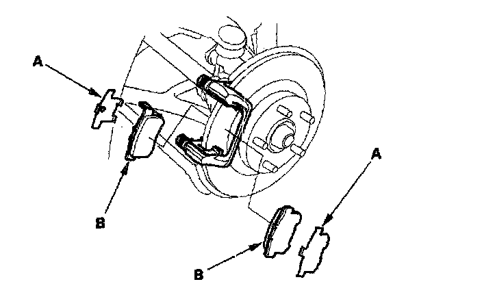 5. Using vernier calipers, measure the thickness of each brake pad lining. The measurement does not include the pad backing plate (A) thickness.