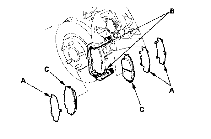 3. Remove the pad shims (A), retainers (B), and brake pads (C).