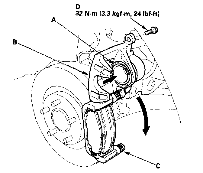 12. Pivot the caliper (B) down into position, being careful not to damage the pin boot. Hold the caliper pin (C) with a wrench, being careful not to damage the pin boot. Install the caliper bolt (D), with another wrench, and torque it to the proper specification.
